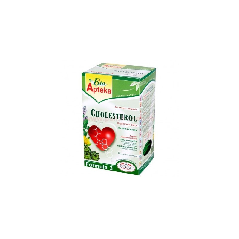 Herbatka Cholesterol polecana jest zwłaszcza osobom z podwyższonym poziomem cholesterolu LDL i trójglicerydów we krwi. Zawiera kompozycje roślin w odpowiednio dobranych proporcjach które korzystnie wpływają na metabolizm, pozwalają w sposób naturalny utrzymać właściwy poziom cholesterolu we krwi. Cholesterol jest substancją tłuszczową produkowaną przez nasz organizm, jak również dostarczany wraz z pożywieniem. Ten tłuszczowy związek jest wytwarzany i przetwarzany w naszym organizmie w kilku frakcjach o zróżnicowanych właściwościach. Cholesterol oznaczony symbolem HDL - jest uważany za tzw. „dobry”, cholesterol oznaczony symbolem LDL - jest uważany za tzw. „zły” - jego podwyższony poziom jest szkodliwy dla organizmu, szczególnie dla układu krążenia. Tłuszcz jest potrzebny do życia jednak w odpowiednich ilościach oraz proporcjach.